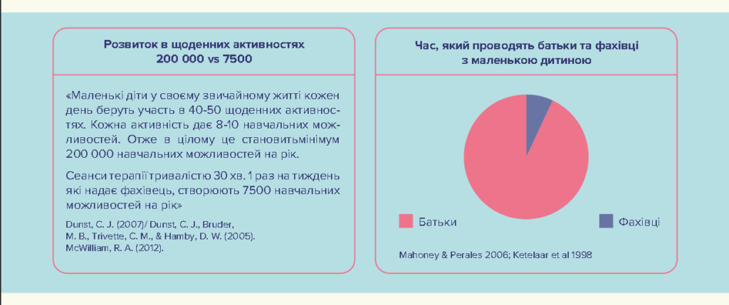 Родина та її повсякденні справи – це природне середовище, в якому маленька дитина росте та навчається, набуває необхідних навичок. Воно може сприяти її розвитку або його гальмувати. Саме тому послуга РВ надається в типових повсякденних активностях дитини із залученням батьків, що збільшує кількість можливостей для її навчання у порівнянні з роботою з дитиною в центрі (приміщенні надавача).