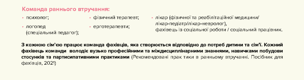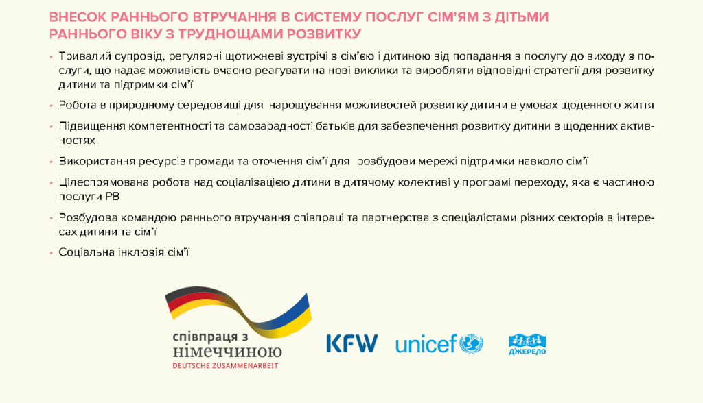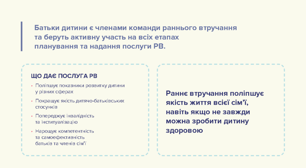 Послуга раннього втручання (РВ) – послуга для сімей з дітьми у віці від народження до чотирьох років, які мають порушення розвитку або в яких існує ризик виникнення таких порушень. Послуга РВ дозволяє чітко ідентифікувати проблеми щоденного життя сімей, які пов’язані з проблемами розвитку дитини, визначити розвивальні стратегії відповідно до індивідуальних потреб дитини та, базуючись на пріоритетах сім’ї, впровадити разом з батьками ці стратегії в щоденне життя родини.