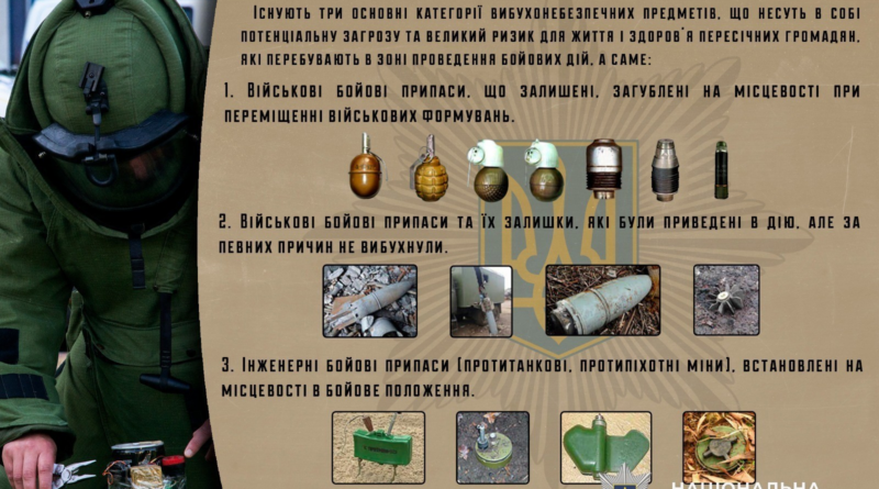 Існують чотири основні категорії вибухонебезпечних предметів, що несуть в собі потенційну загрозу та великий ризик для життя і здоров'я пересічних громадян, які перебувають в зоні проведення бойових дій, а саме:
